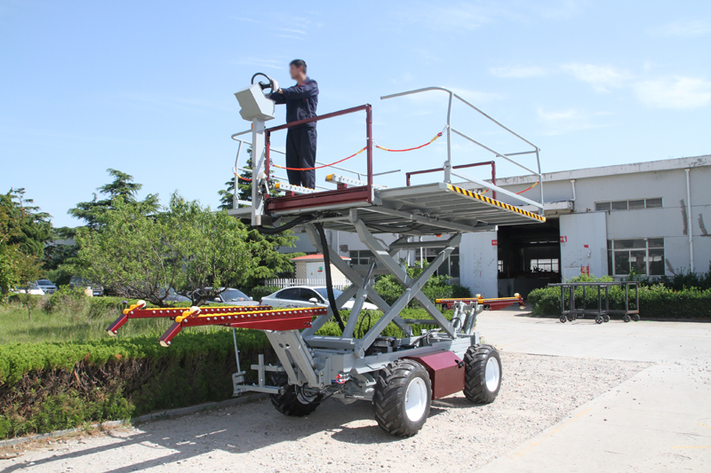 4GP-1200DA diesel full hydraulic drive picking operation platform is a diesel full hydraulic full size four wheel four drive picking operation platform developed by Zoomye Company for medium and large-scale park users. The operating surface is 3m x 3m, which can accommodate 6-8 operators+2 500 kg standard fruit baskets at the same time. It is a high-end product of Zoomye 1200 series platform. It has excellent off-road ability, strong power performance, excellent operation comfort, high efficiency, high reliability High life, high fuel economy, easy maintenance and other characteristics.
